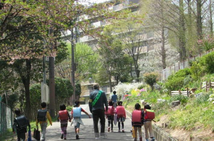 この写真は、私が住んでいる新千里東町の風景ですが、このような車に出会わない道(歩行者専用道路)がまちを巡っています。小学生たちの下校を高齢者たちが見守りをしている場面ですが、これもコミュニティづくりの一つかなと思います。