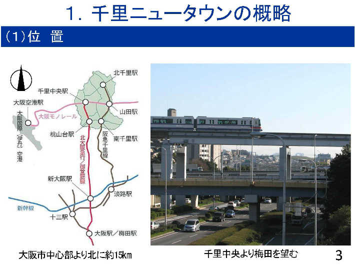 今日は、千里ニュータウンの計画的な特色やコミュニティ再生の話をさせていただきます。千里ニュータウンは約50年前に建設され、現在はニュータウン第3世代が成人になりだしたという状況にあります。年を経てまちの姿も変わってきましたが、それとともにコミュニティがどう変わってきたのか、コミュニティ再生がどうなされているのか、などをご紹介します。コミュニティをいかにつくっていくのか、あるいは意図的につくるべきなのかは、千里ニュータウンだけでなく、どのまちにも共通するものなので、千里の例を見ていただき皆さんが考えられているコミュニティやコミュニティづくりなどについて意見交換ができればと思います。