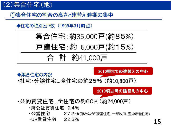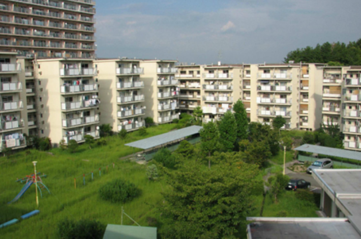 住宅の水準につきましては、大量供給の求めに応じて、40m2程度の2DKを数多く確保するように計画された団地が多く、狭小でかつ設備の問題(配管などの取り換えの困難さ)がありました。一方、団地の全体計画や配置計画には工夫がされています。府営住宅では囲み型住棟配置によって中庭が確保され、住民同士が交流しやすい環境をつくっています。