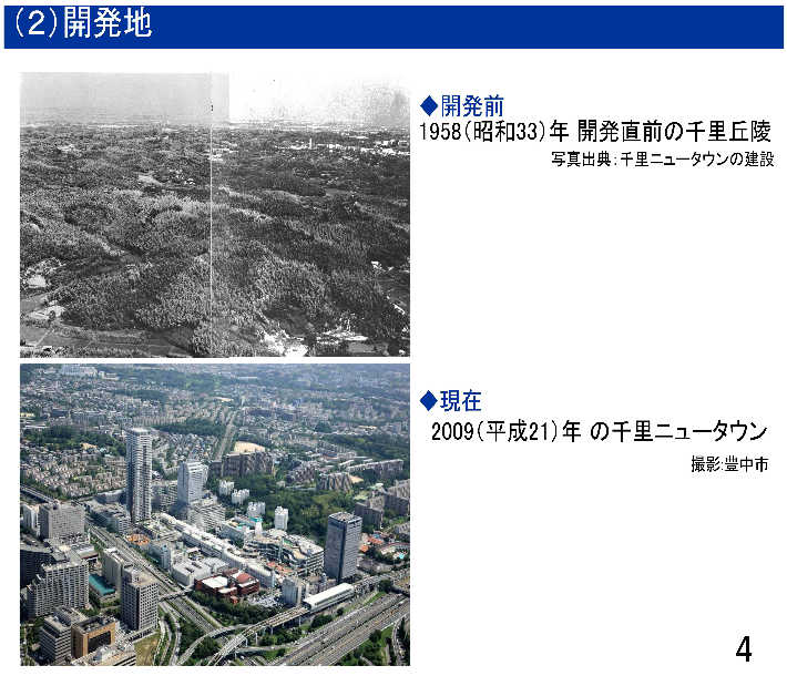 千里ニュータウンの開発の目的ですが、昭和30年代は大都市への人口集中が始まった頃で、大阪にも地方から若い働き手が集まってきました。住宅が足りないので郊外の田畑を開発していくわけですが、道路や下水も十分整備されないままに開発が進んでいくという状況でした。それでは良くない、ちゃんとした住宅都市をつくろうということで千里丘陵をニュータウンとして計画的に開発することになりました。