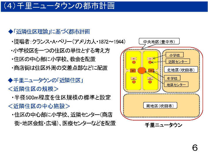 千里ニュータウンはどういった考え方でつくられたかといいますと、アメリカ人のペリーという人が提唱した近隣住区理論に基づいています。