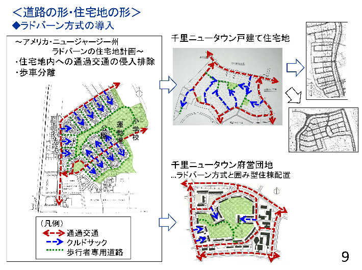 まちづくりでは色んな手法が導入されました。ニュータウン計画にあたっては外国の多くの先進事例を学んで導入しましたが、その一つがラドバーン方式です。