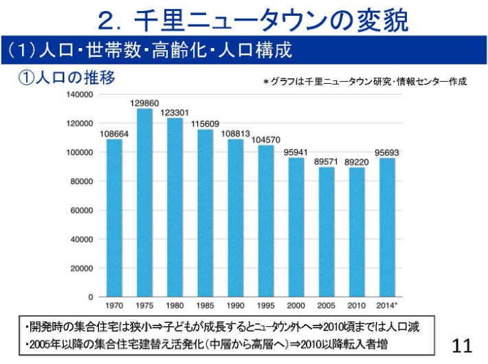 当初供給された住宅は狭く、成長した子どもたちはニュータウン外に出て行くことになり、親だけが残るという状況でした。これが1980年代から2010年ぐらいまでの世帯数の変化のなさに現れています。かつて、住み替え行動について住宅双六という考え方がありました。文化住宅から始まり、アパート、公団住宅、最後に戸建て住宅に住んで上がりというものですが、千里ニュータウンでは交通の便が良いのでずっと一か所(府営住宅など)に留まりました。環境が良いので住宅双六のようにはなりませんでした。