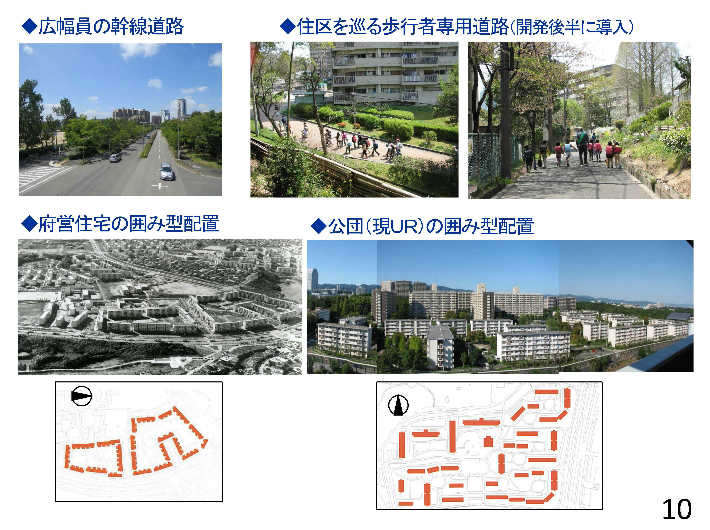 中庭をつくって住民同士が顔を合わせて交流しやすくしようというのが囲み型配置ですが、西向きや東向きの住戸ができます。これに対して建築学会からは性能の悪い西向きの住棟をなぜつくるのかとの反対意見があり大阪府との間で議論がありましたが、西側の窓に日よけを付けて対処することで収まりました。このような問題はありましたが、囲み型配置によってコミュニティを育てようという基本的な考え方がありました。当時住宅公団は南向きの平行配置を標準としていましたが、千里ニュータウンの一部の団地では囲み型住棟配置を導入しています。