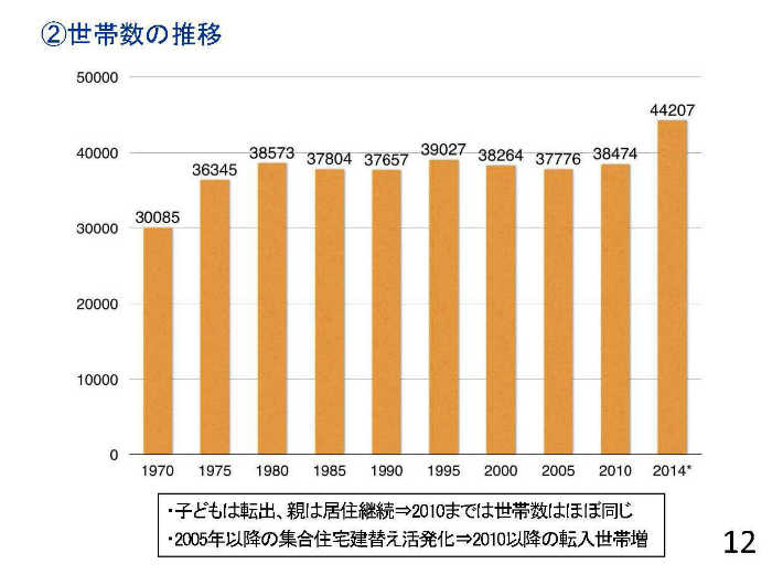 2014年以降の人口・世帯数の増加は、集合住宅の建て替えに伴う転入増によるものです。
