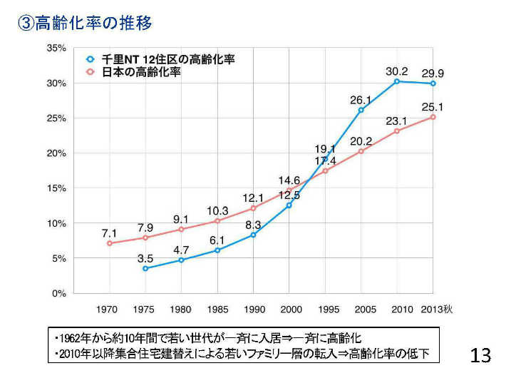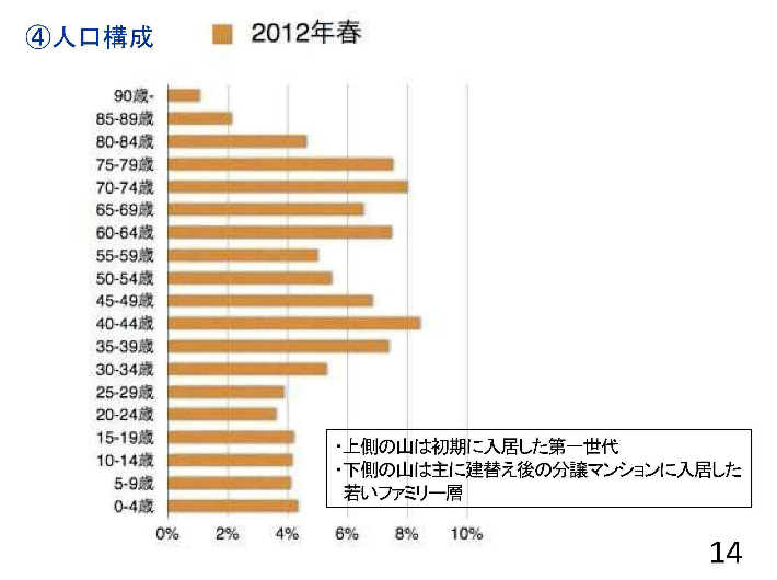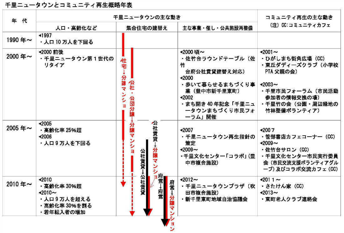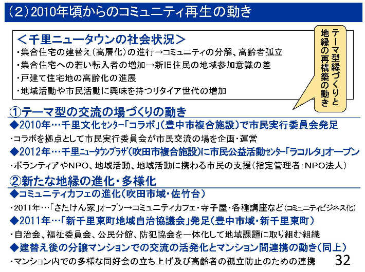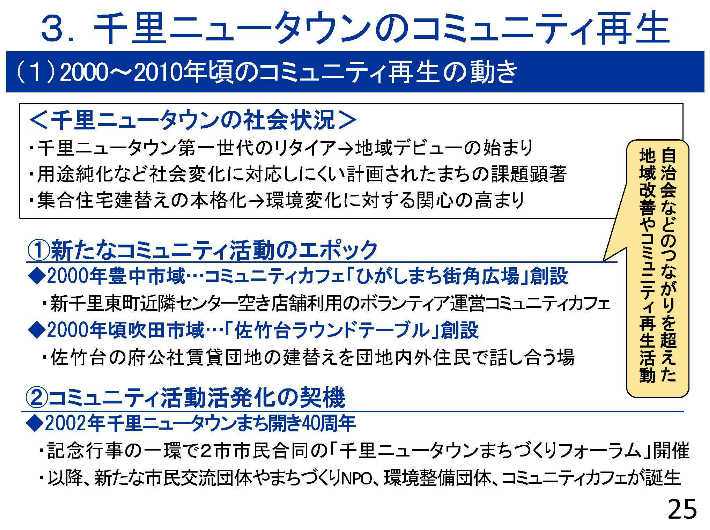 2010年頃からは千里ニュータウンの状況も変わり、コミュニティ再生のあり方も変わってきました。建て替えが進行していくなかで、コミュニティの分解が始まり、高齢者は孤立していくということが一部に起きてきます。そして、一方で若い世代の転入者が増えてきます。新旧の住民の交流がない、若い住民は地域の活動に参加しない、ということも起きてきます。戸建て住宅も一層高齢化してきますし、地域活動に参加したいというリタイア層も増えてきます。