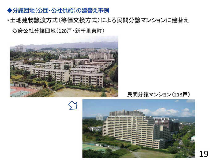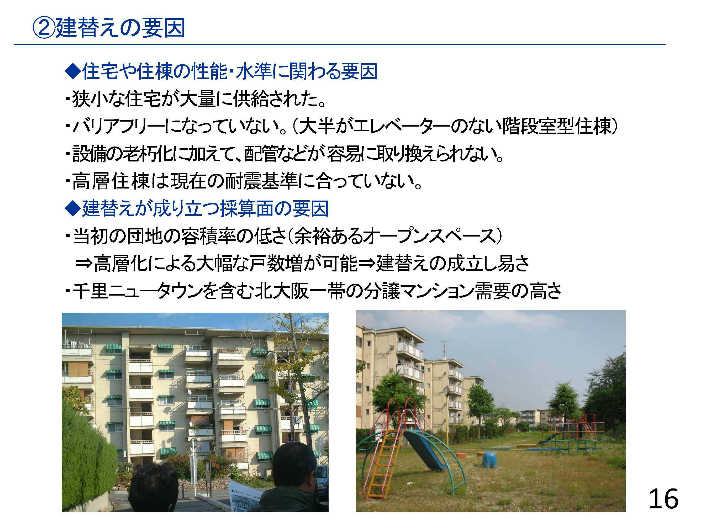 建て替えがどうして成り立つのかですが、写真のように元の中層住棟による配置は低容積率の非常にゆったりとしたものになっていたため、高層にして戸数を増やすという建て替えが成立しやすいということがあります。もう一つの大きな要因は、千里ニュータウンのある北大阪一帯ではマンションの人気が高いということがあります。建てれば売れるという状況です。