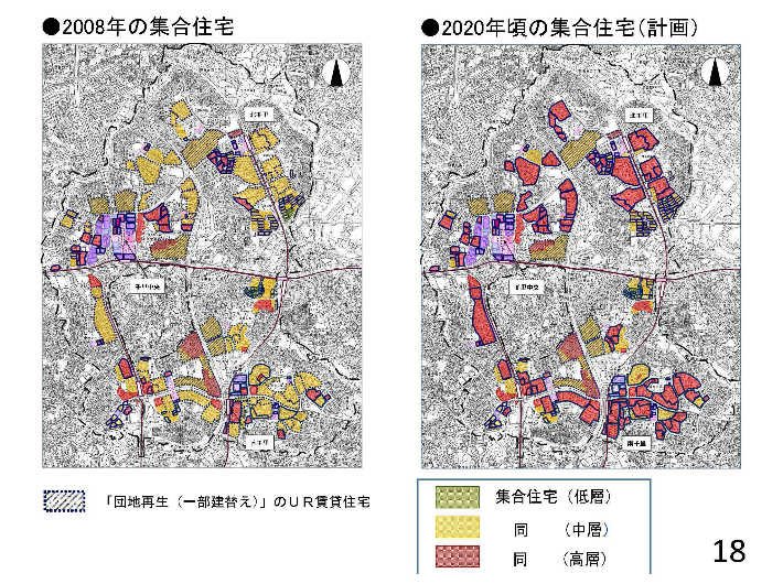 大阪大学前学長の鷲田先生は、千里ニュータウンの問題点は、お寺や教会がない、大木がない、いかがわしい場所がないことだと言っておられます。ニュータウンは健全、健康なまちとしてつくられました。