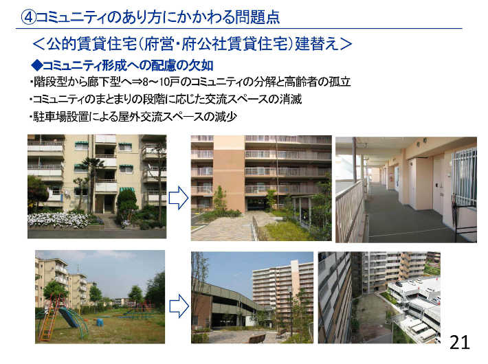 府営や公社(賃貸住宅)の建て替えでは、コミュニティ形成への配慮が欠如しています。