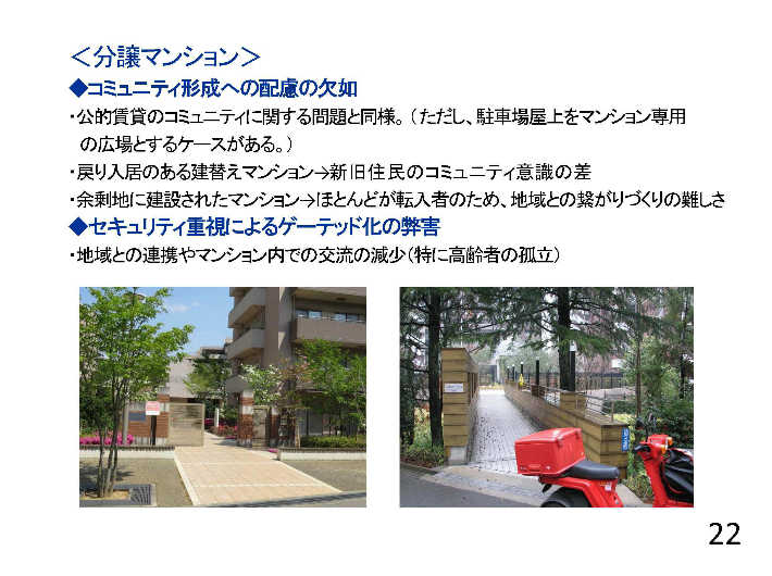 分譲マンションで一番問題なのは、セキュリティ重視ということです。最近のマンションはセキュリティが売りものになっているため、建物はゲーテッド化し、地域との繋がりは難しくなります。門、住棟玄関、住戸玄関など何段階ものゲートを通過しなければ入れないため、特に高齢者の孤立につながることが予測されます。