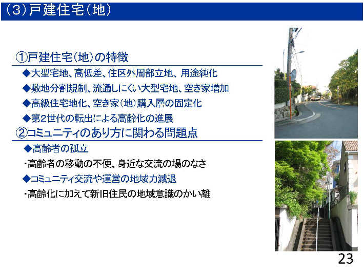 戸建て住宅は宅地も住宅も大きいため、独りで住んでいる場合、多くは2階の雨戸が閉まっていて高齢者世帯いということがわかり、防犯上問題となっています。また住宅地は住宅用途に純化されているため、人の行き来が少ないことも防犯上の問題です。集合住宅は駅の近くの平らな場所にありますが、戸建て住宅は駅から離れた高低差のある敷地にあり、高齢者には暮らしにくい状況にあります。
