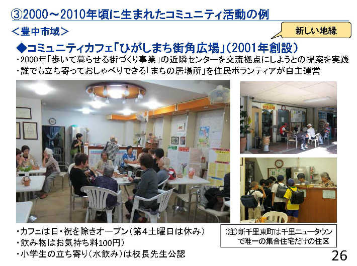 当時の都市計画の最先端の様々な試みが取り入れられた千里ニュータウンですが、私は、その後どのように生活がなされているのか、コミュニティがどう変化しているのか、計画されたまちのその後を観察してみようということで、15年ほど前に千里のコミュニティ活動に参加することにしました。現在は、後ほど紹介しますコミュニティ・カフェのひがしまち街角広場の代表を務めています。また、昨年度までは豊中市の複合施設で、市民交流の場を運営し交流を盛り立てようという千里文化センター市民実行委員会の代表をしていました。