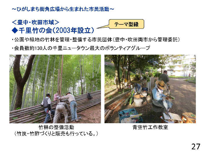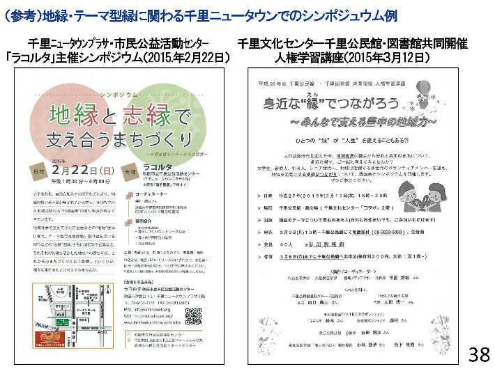 一方、吹田市側(南千里)では、千里ニュータウンプラザという市の複合施設がオープンし、この建物の中にNPOが指定管理者となって運営する市民公益活動センターが設けられました。ボランティアやNPOなどの地域活動の相談に応じたり支援するための施設です。これは、地縁づくりの支援ということもありますが、市民が自分のやりたいことやできそうなことで地域に貢献したいという要望に応えるための「テーマ型」縁づくり支援の動きです。