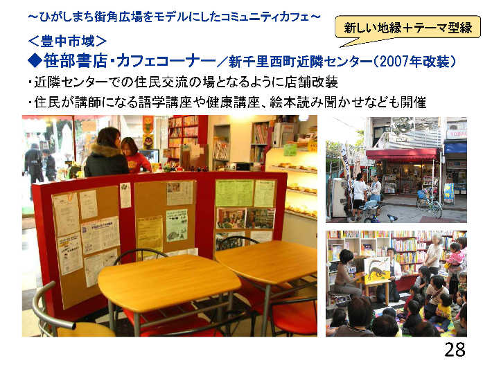 このような中で、評価できる活動の例として、書店の中にカフェをつくった「笹部書店」と若いお母さんたちが運営する「さたけん家」を挙げることが出来ます。