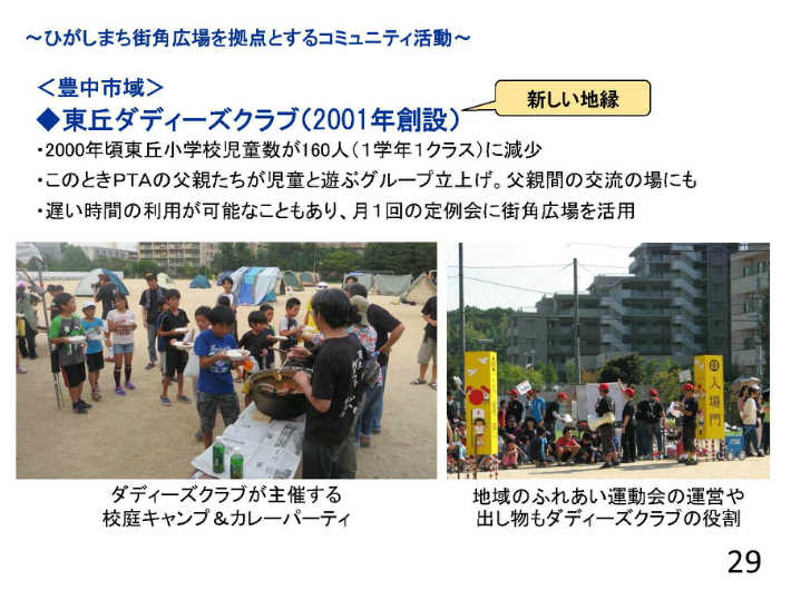 もう一つは、小学校のPTAやそのOBのお父さんたちでつくる「東丘ダディーズクラブ」です。子育て支援がテーマですが、親たちも繋がり、地域とも繋がっているという集まりです。