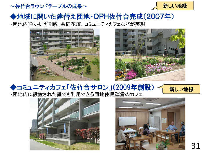 公社団地の建て替え完了後もラウンドテーブル受け継がれ、佐竹台の団地を建て替える時にはラウンドテーブルを開いて、佐竹台の住民は誰でも建て替えについて意見が言えるようになっています。また、団地の建て替えだけでなく、コミュニティ・カフェをつくりたいといった場合にもラウンドテーブルで議論されています。