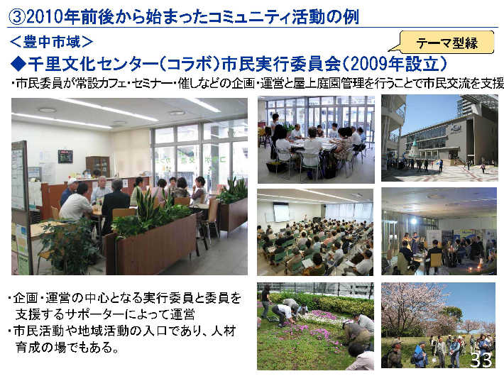 このような背景があり、それまでは「地縁型」の交流の場づくりが中心でしたが、「テーマ型」の交流の場をつくろうという動きが出てきます。
