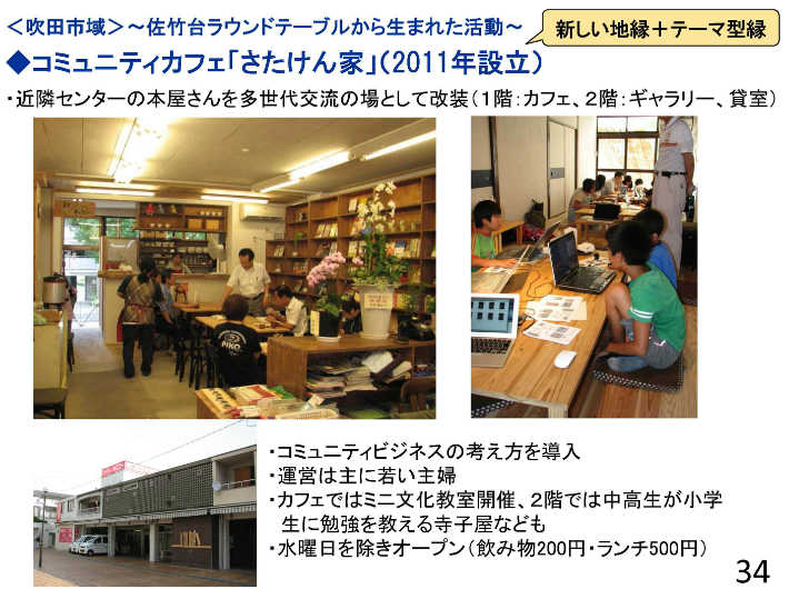 「地縁型」の進化したかたちが佐竹台近隣センター(吹田市域)にあるコミュニティ・カフェ「さたけん家(ち)」です。本屋をリノベーションして、カフェのほかに地域住民が運営する寺子屋(子どもの勉強会)や講座を開催しています。