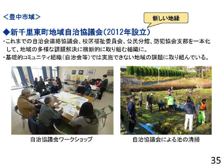 私が住んでいます新千里東町では地域自治協議会が発足しました。これまでの地域運営は、自治会連絡協議会、校区福祉委員会、公民分館、地域防犯支部などが個別に行い、行政に対してもそれぞれが別個に交渉していました。これらを地域の中で一本化して行政とのパイプも一つにすることで、総合的な視点から地域の課題に取り組もうというものです。
