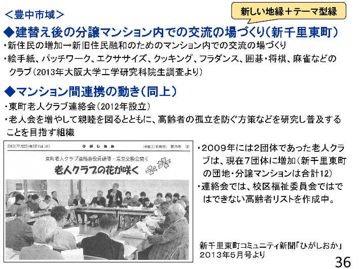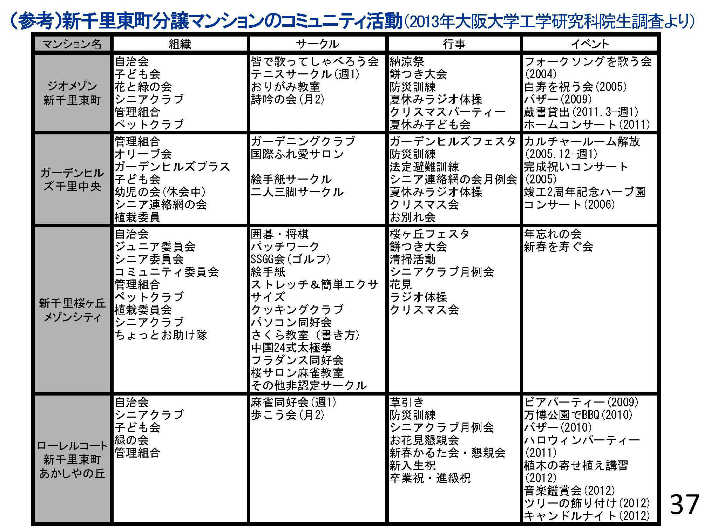 これは大阪大学の大学院生がまとめた新千里東町の分譲マンションのコミュニティ活動の調査結果ですが、マンションは戸数が多いので、マンションごとに多様なサークルがあります。このようにマンション内では交流が盛んになってきていますが、地域との交流についてはまだまだ活発だとは言えません。