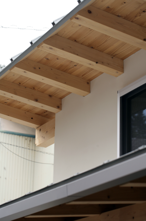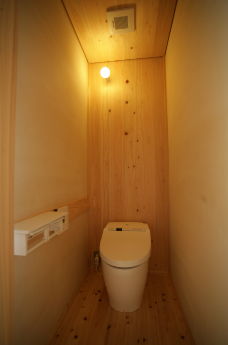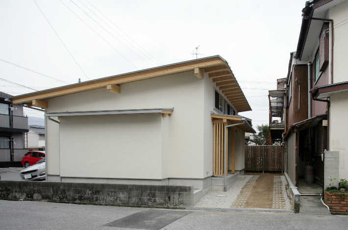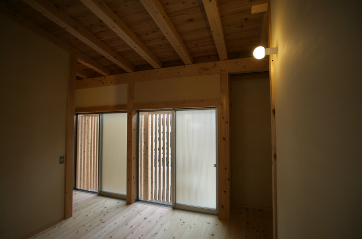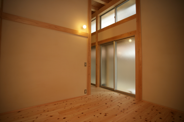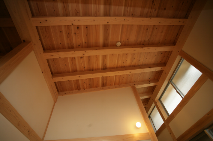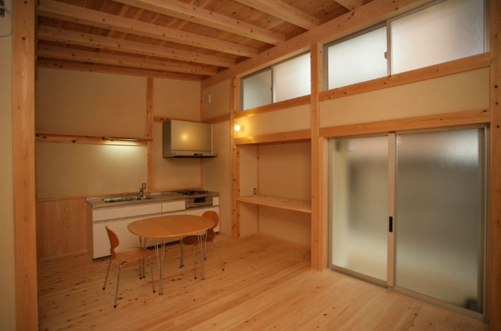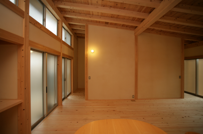 夫婦二人で暮らす16坪の平屋、必要な広さと使い勝手をとことんシンプルにそぎ落としたシンプルでコンパクトなプランです。3mを越す高い天井と壁だけで仕切った空間はゆったり広々としています。仕上は自然の素材にこだわりました。床と天井は100%地域の山で採れたヒノキとスギ、壁は竹小舞土壁に土佐漆喰の仕上です。見た目も肌触りも心地よく、室内の湿度が安定するので快適です。耐震性と省エネルギーに優れた長期優良住宅同等の仕様です。